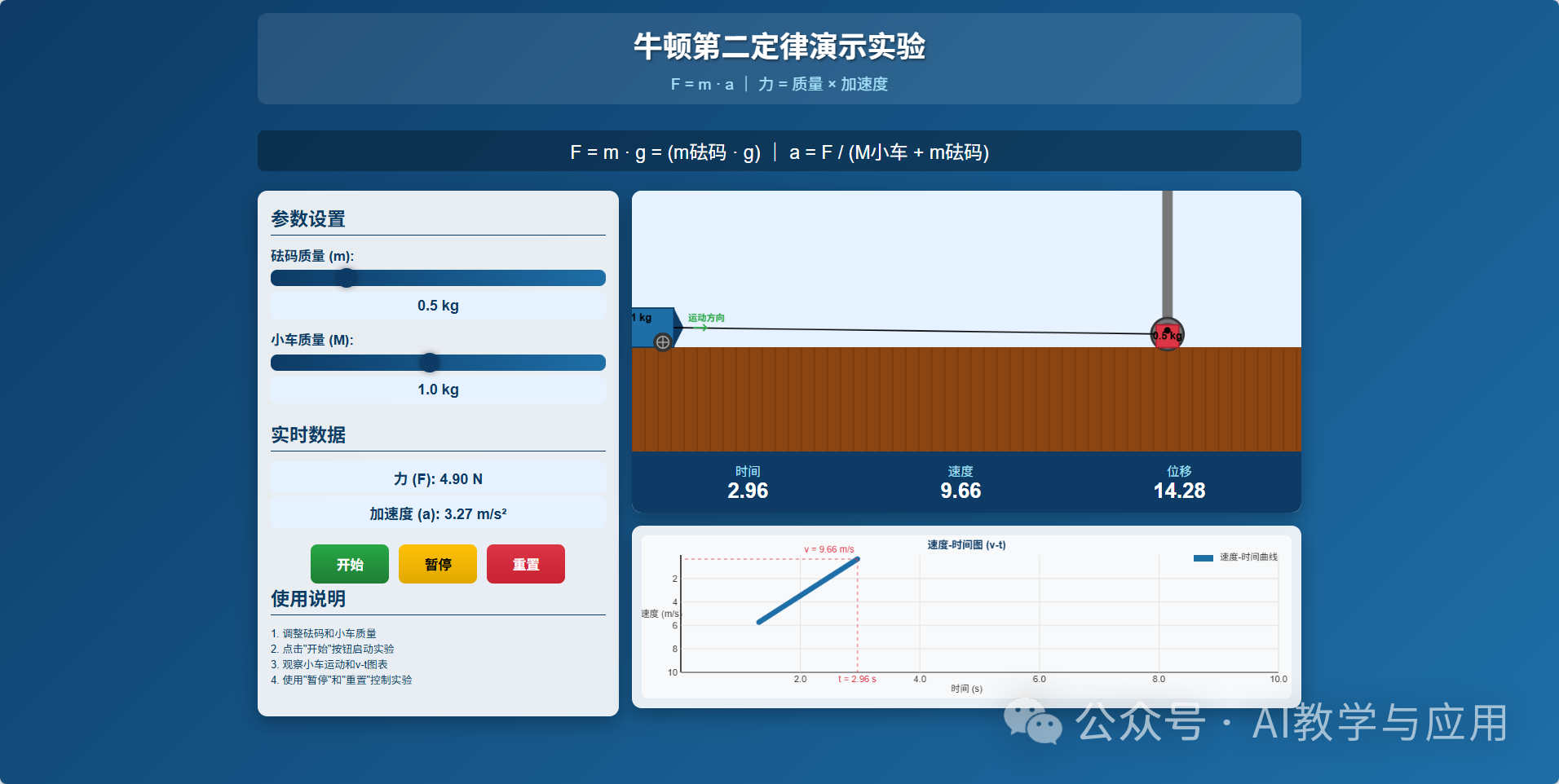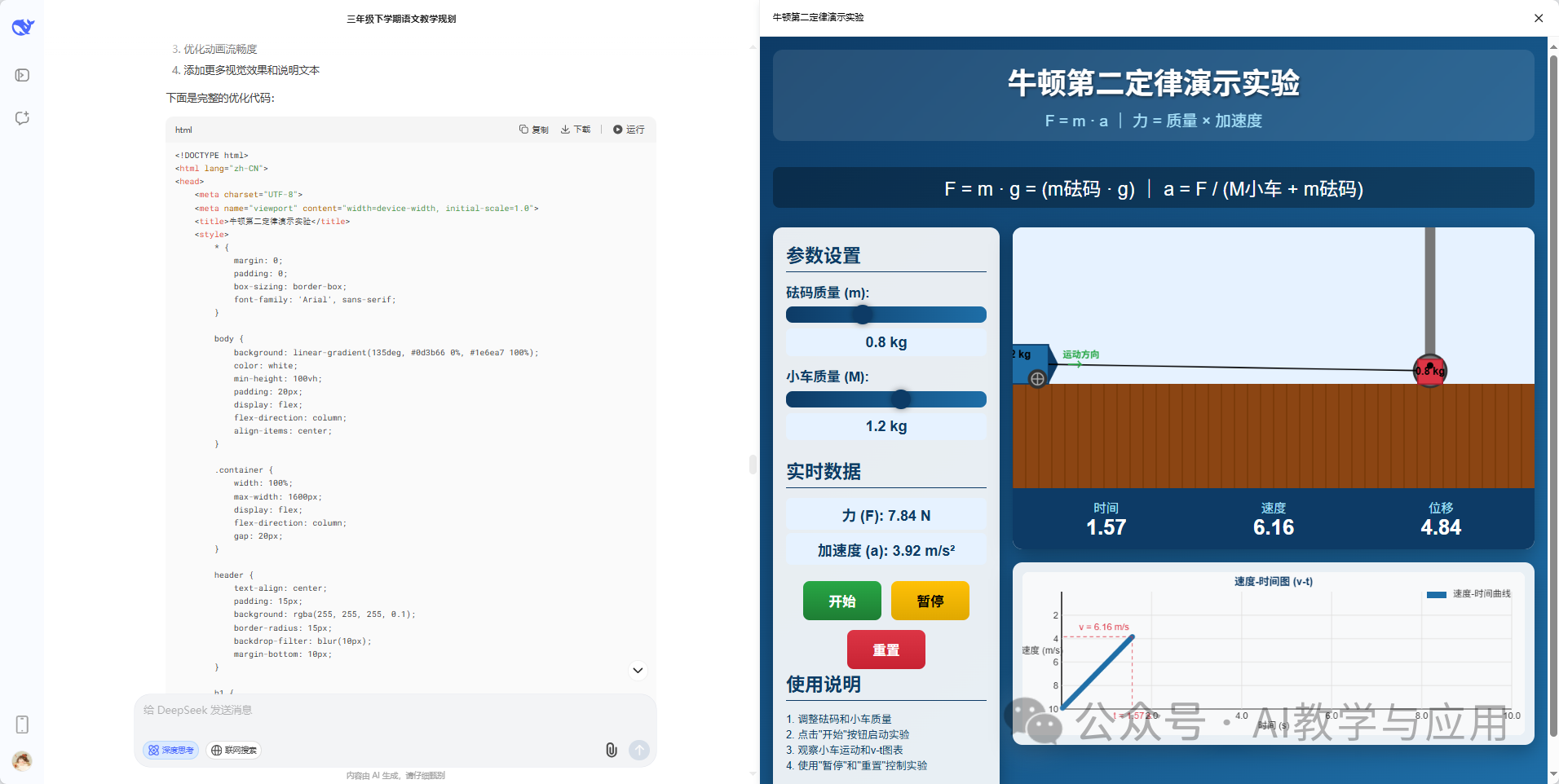 比如,老师想为八年级学生讲解“牛顿第二定律”,向DeepSeekV3.1输入提示词:“请用 HTML+ Canvas制作牛顿第二定律演示动画:场景为水平桌面上有一辆小车,通过细线绕过定滑轮悬挂不同质量的砝码;交互方面,页面左侧提供砝码质量m和小车质量M两个滑条(范围0.1–2.0kg,步长0.1kg);实时计算 F =mg , a= F / (M + m),并在画面右上角实时显示F、a的数值;动画部分,点击开始按钮后,小车按计算出的加速度运动,同时出现速度-时间v - t图实时绘制;控制部分带暂停/继续重置按钮;风格为科技蓝+白底+大字号,适配1920×1080投影;以HTML形式输出。”